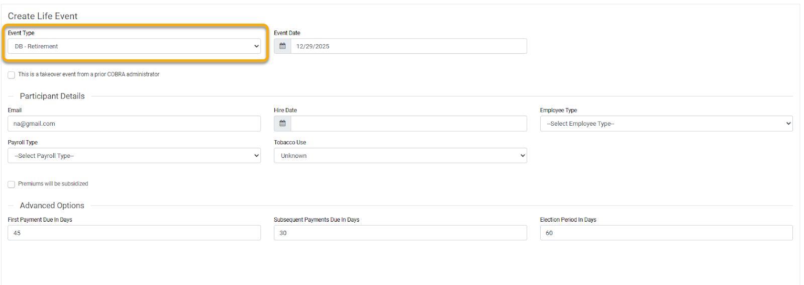 6. Select the Event Type dropdown menu, and choose the correct type from the list of options. For Direct Bill Members, this includes: Retirement, FMLA, or Other. Then enter the Event Date of the Life Event.