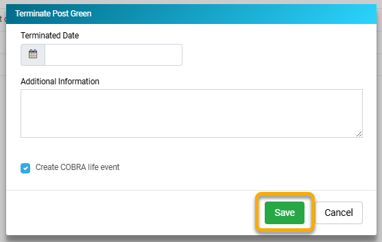 5. Enter the Terminated Date and additional information as needed. Check the box Create COBRA Life Event, then click Save. This will take you to a separate page where you can enter all of the relevant information for the Life Event.
