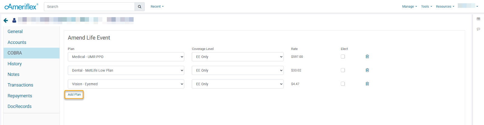 8. Select Plans using the dropdown. When selecting the plans that a Qualified Beneficiary (QB) is eligible for, ensure you also select the appropriate Coverage Level. Based on the coverage level chosen, any dependents will automatically populate in the Dependents section. The corresponding rate will also display next to the Coverage Level. The rate will be adjusted based on the selected coverage level.