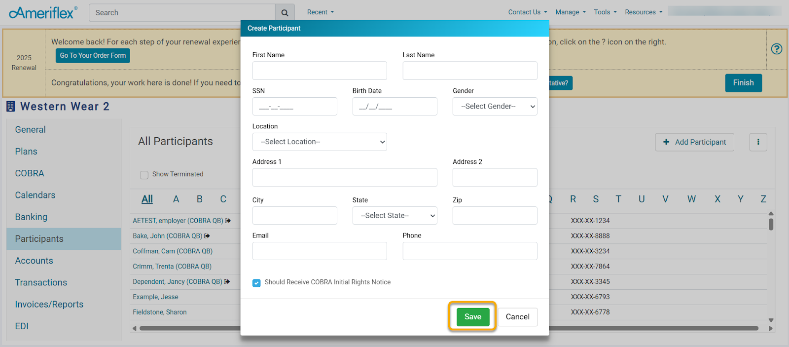 19. On the Create Participant pop-up screen, fill out all requested information, then click Save.