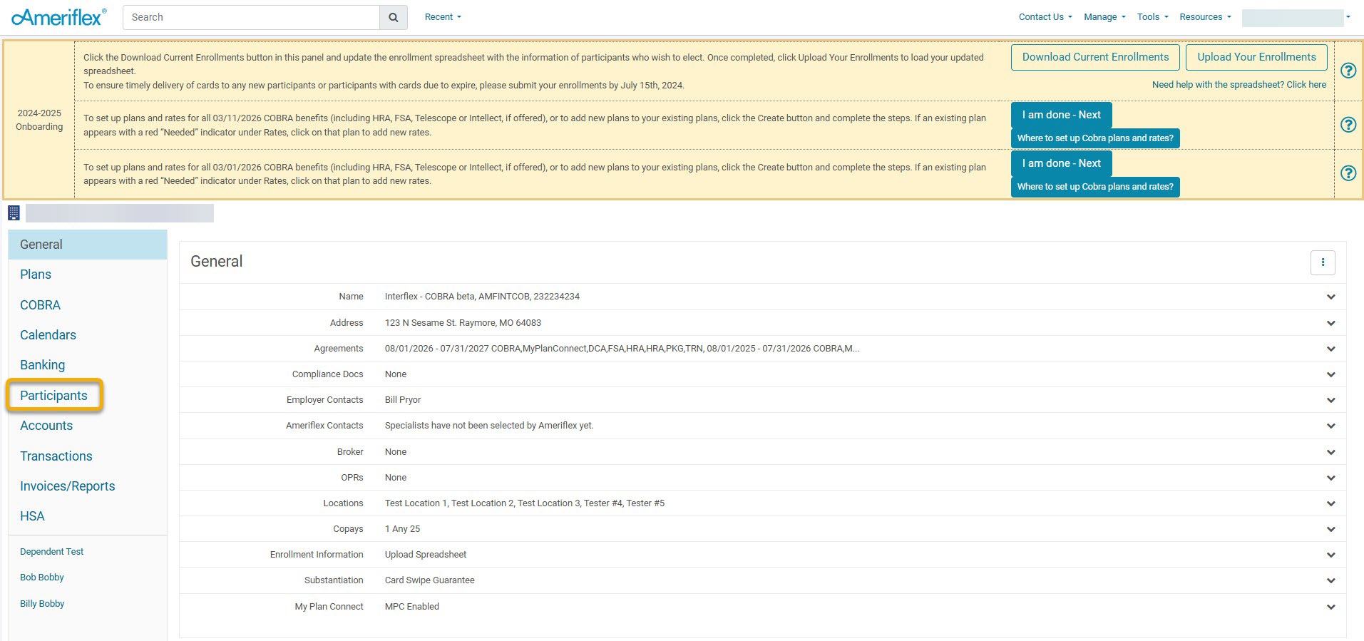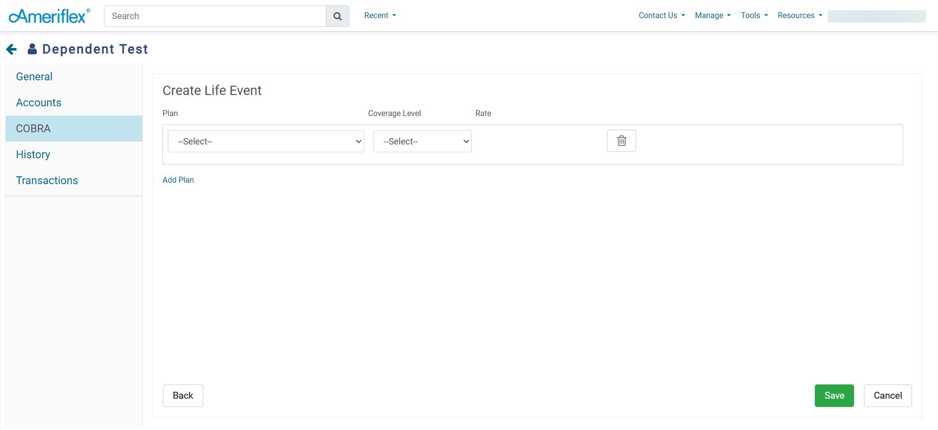 7. Select Plans using the drop-down. When selecting the plans for which a Qualified Beneficiary (QB) is eligible, ensure you also choose the corresponding Coverage Level. Based on the selected coverage level, any dependents will automatically populate in the Dependents section. The corresponding rate will also display next to the Coverage Level. The rate will adjust depending on the coverage level selected.