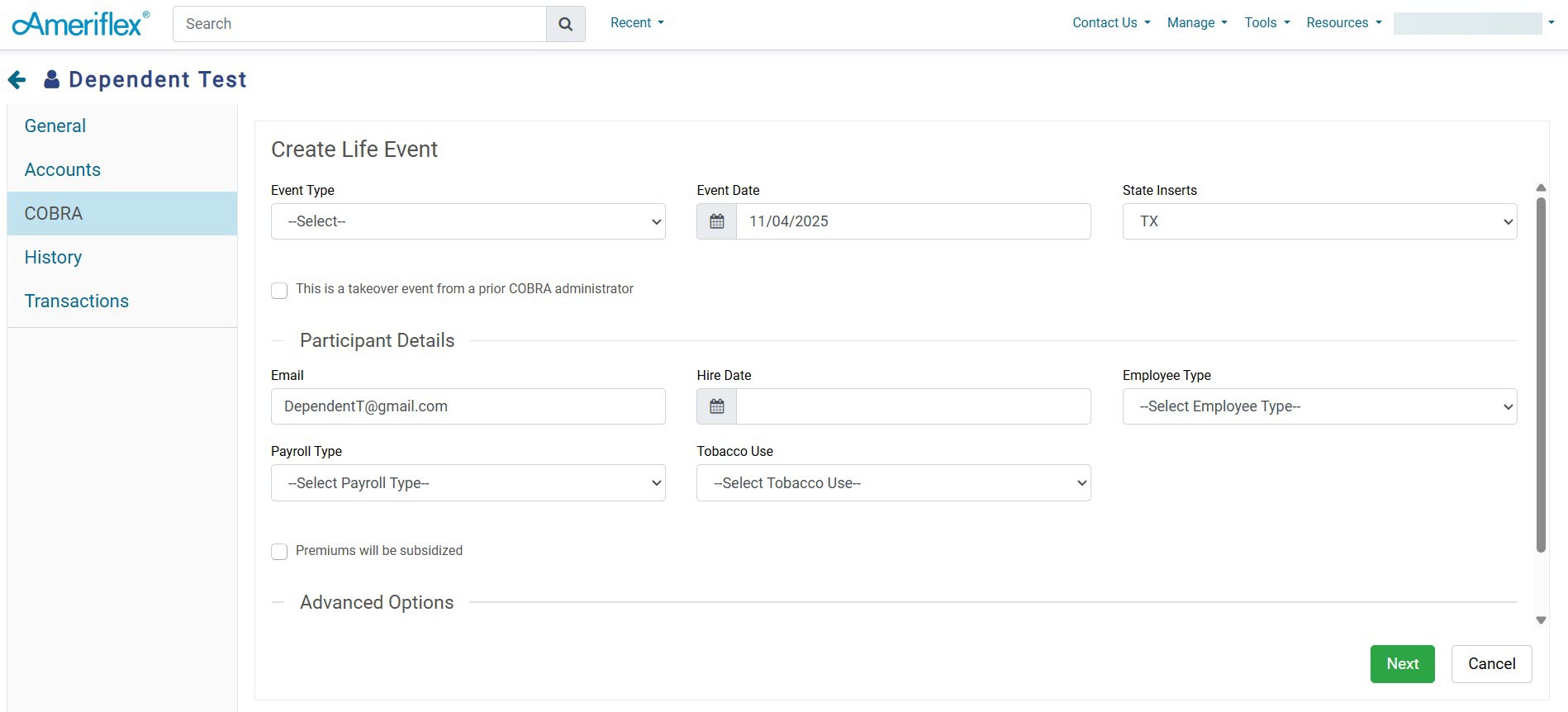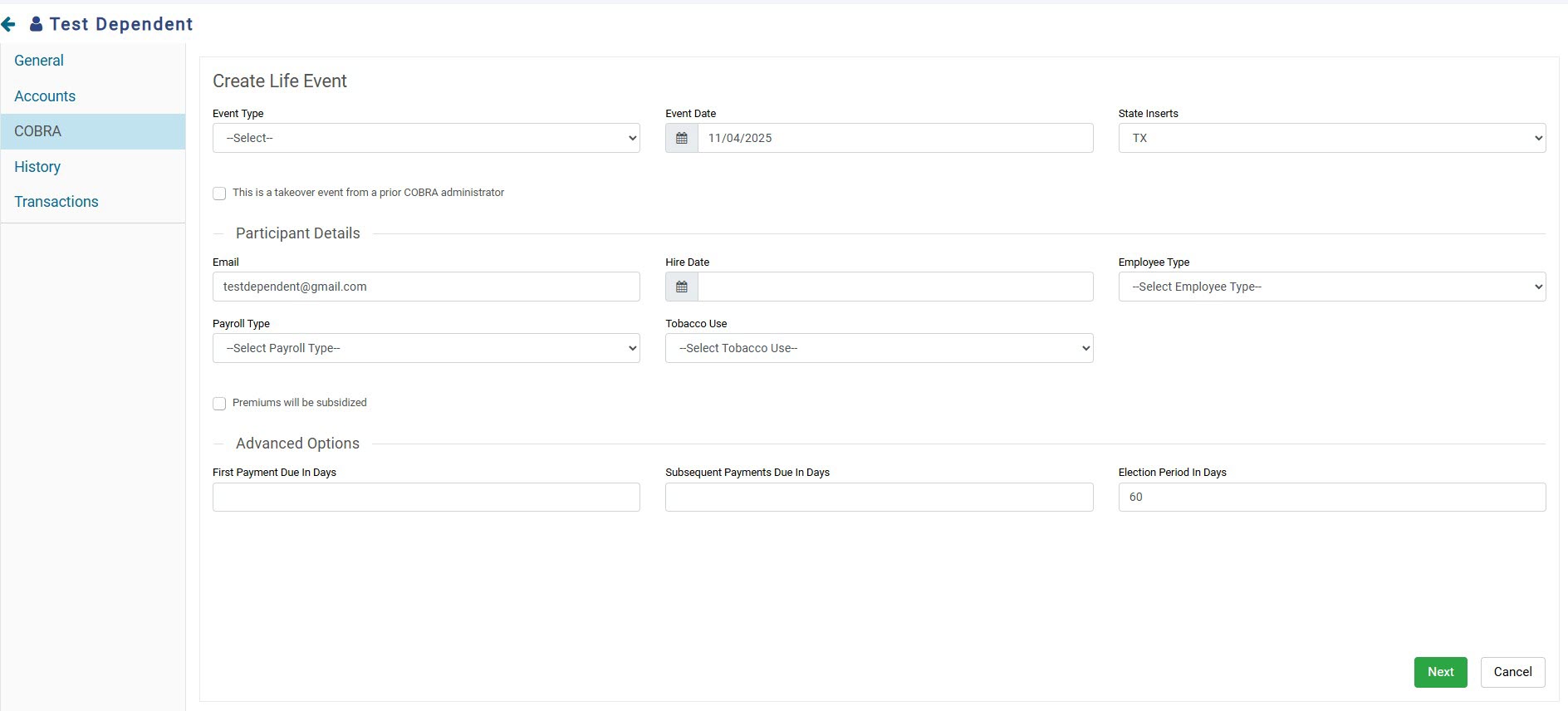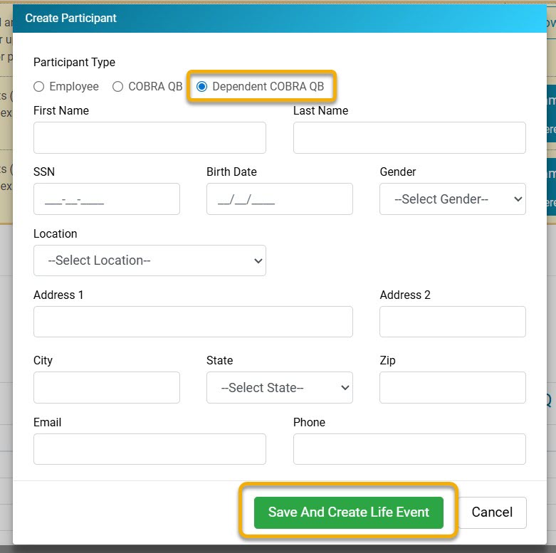 4. On the Create Participant pop-up screen, select Dependent COBRA QB, fill out all requested information, then click Save and Create Life Event.