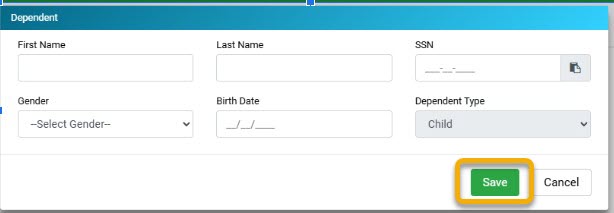 9. A Dependent pop-up screen will appear. Fill in the demographic information in the provided fields, then click Save.