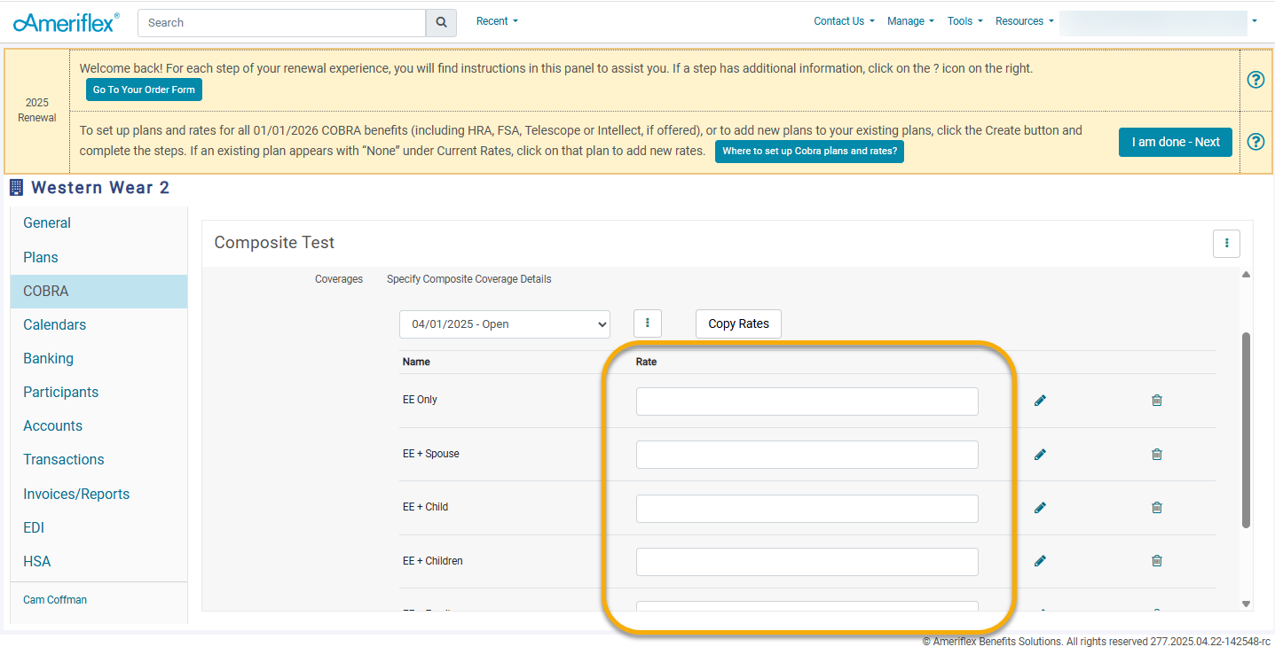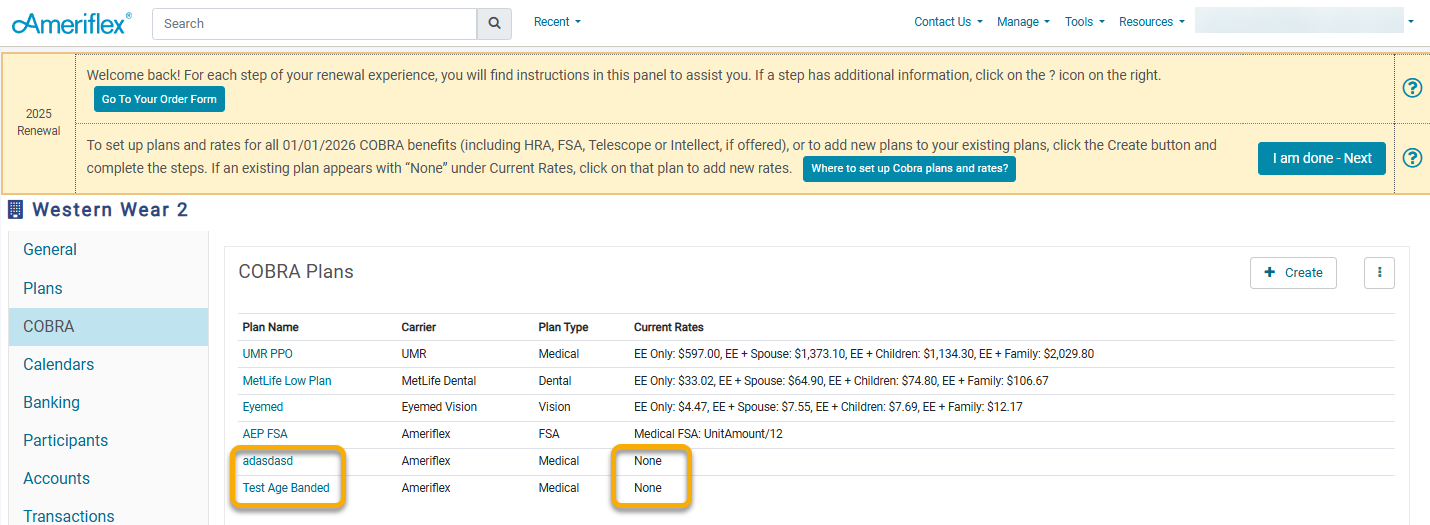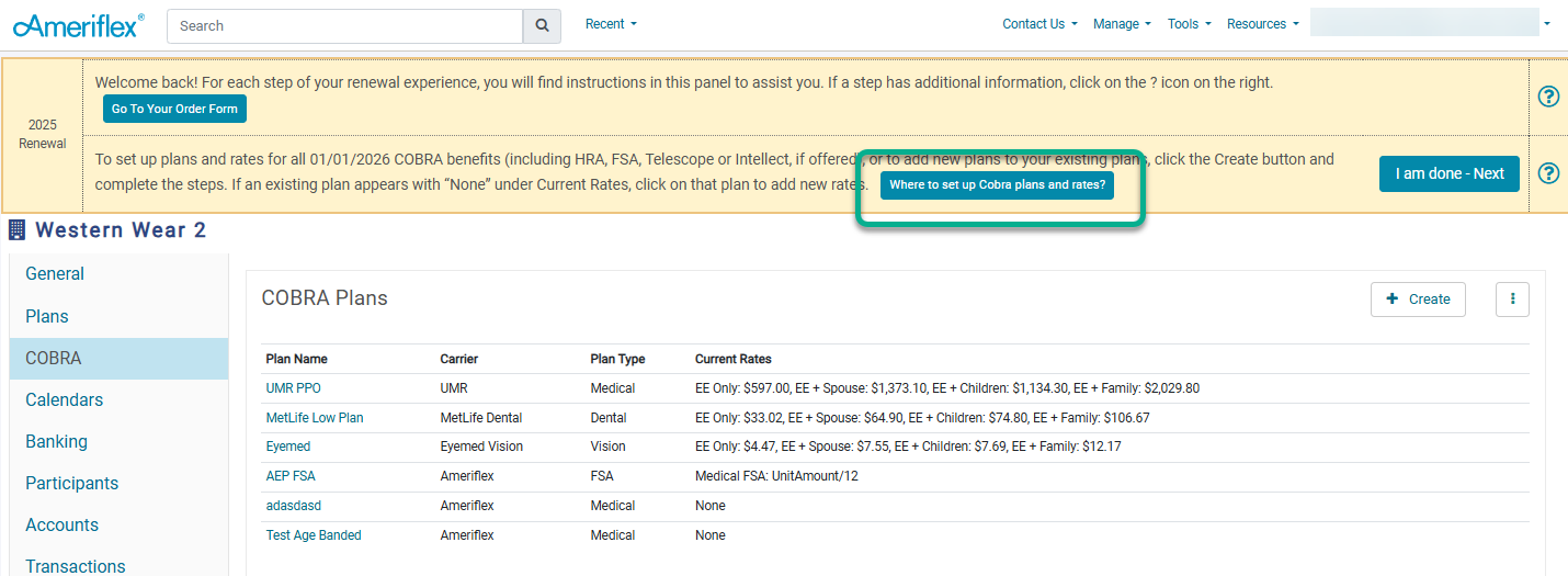 3. To set up plans and rates for all COBRA benefits (including HRA, FSA, Telescope or Intellect, if offered), or to add new plans to your existing plans, click the + Create button and complete the steps. If an existing plan appears with “None” under Current Rates, click on that plan to add new rates.
