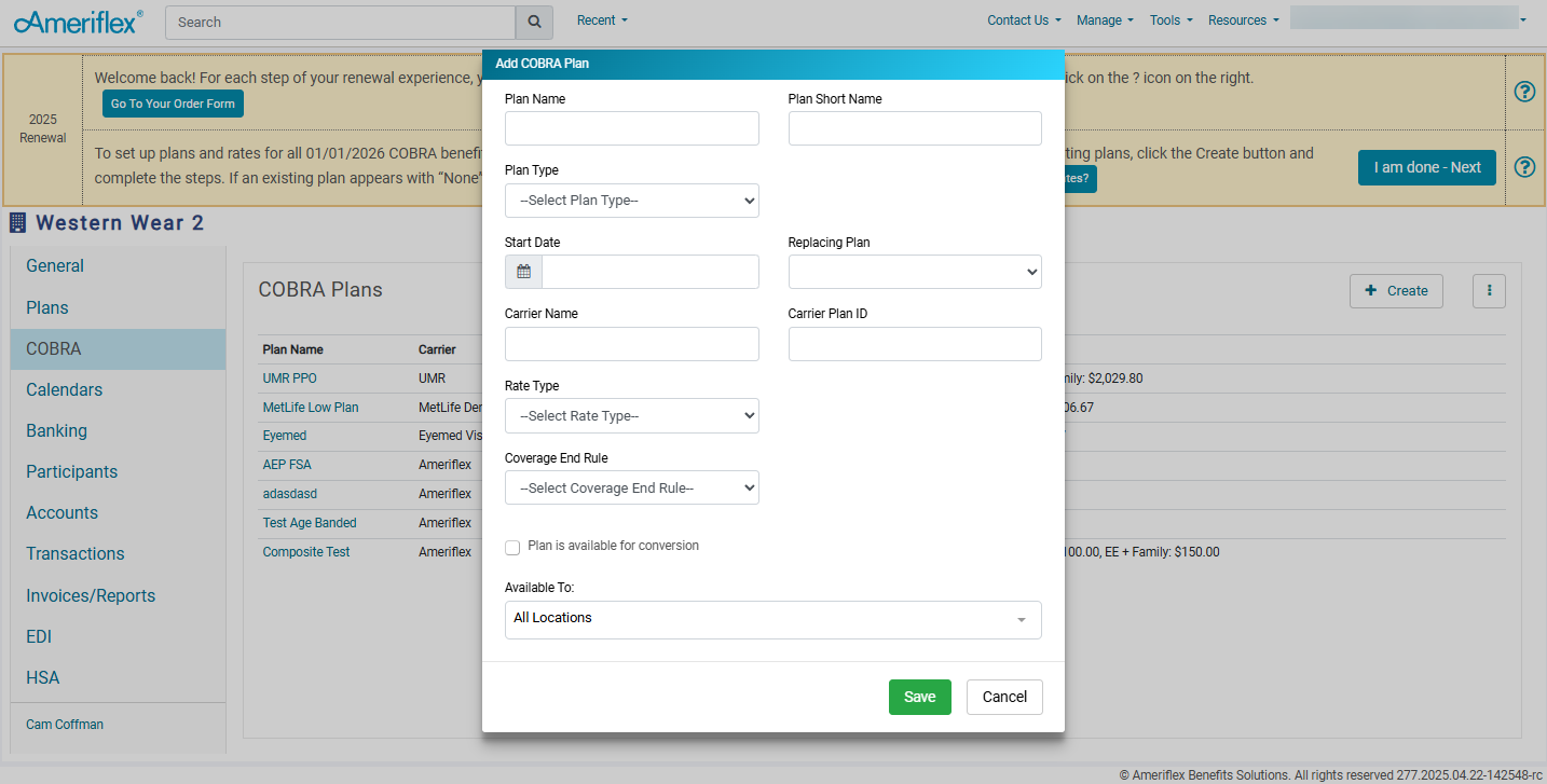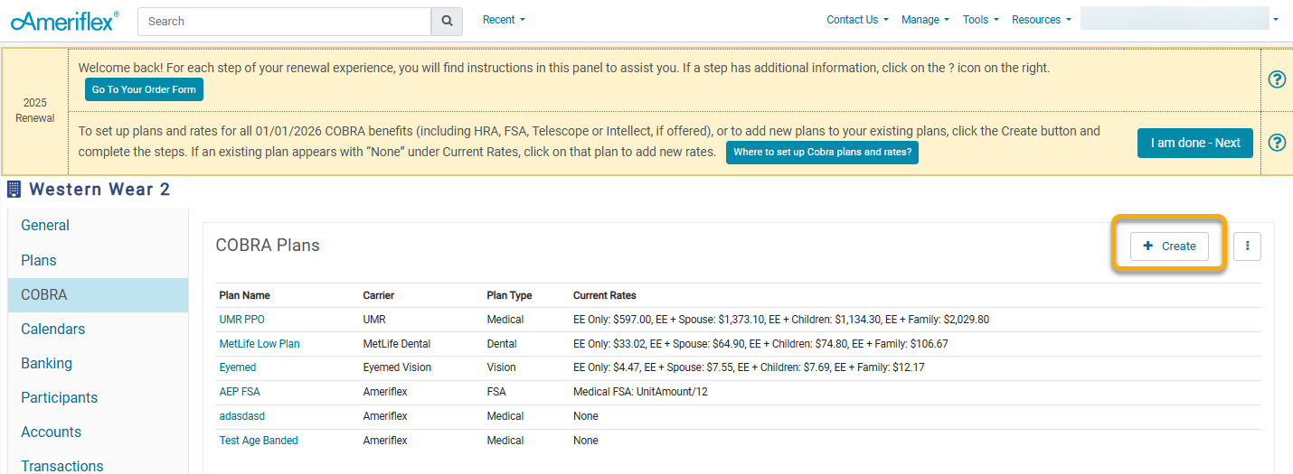9. To add a new plan, return to the main COBRA tab and click the + Create button.