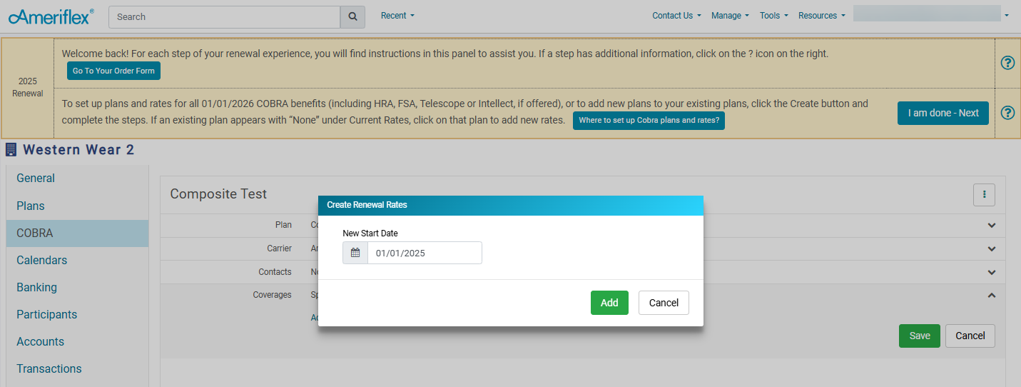 2. On your home page, a yellow guidance panel will appear on the top of your screen to guide you through your renewal or order. Once you reach your COBRA workflow, COBRA Rate Renewal will appear on the left-hand side of the yellow guidance panel, and the blue Where to set up COBRA plans and rates? button will take you directly to the step to configure your rates.