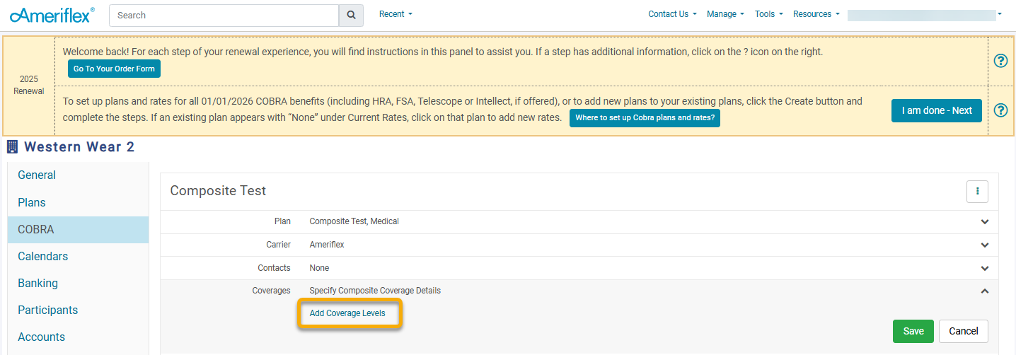 5. Click on the Coverages dropdown, then click Add Coverage Levels.