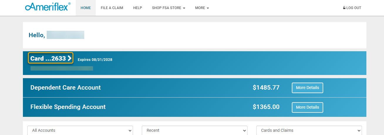 2. At the top of your home screen, beneath your name, you will see "Card" followed by the last four digits of your Ameriflex Debit Mastercard® number and a small arrow. Click Card ...XXXX> to view card information. (Card ...XXXX> circled below).jpg)