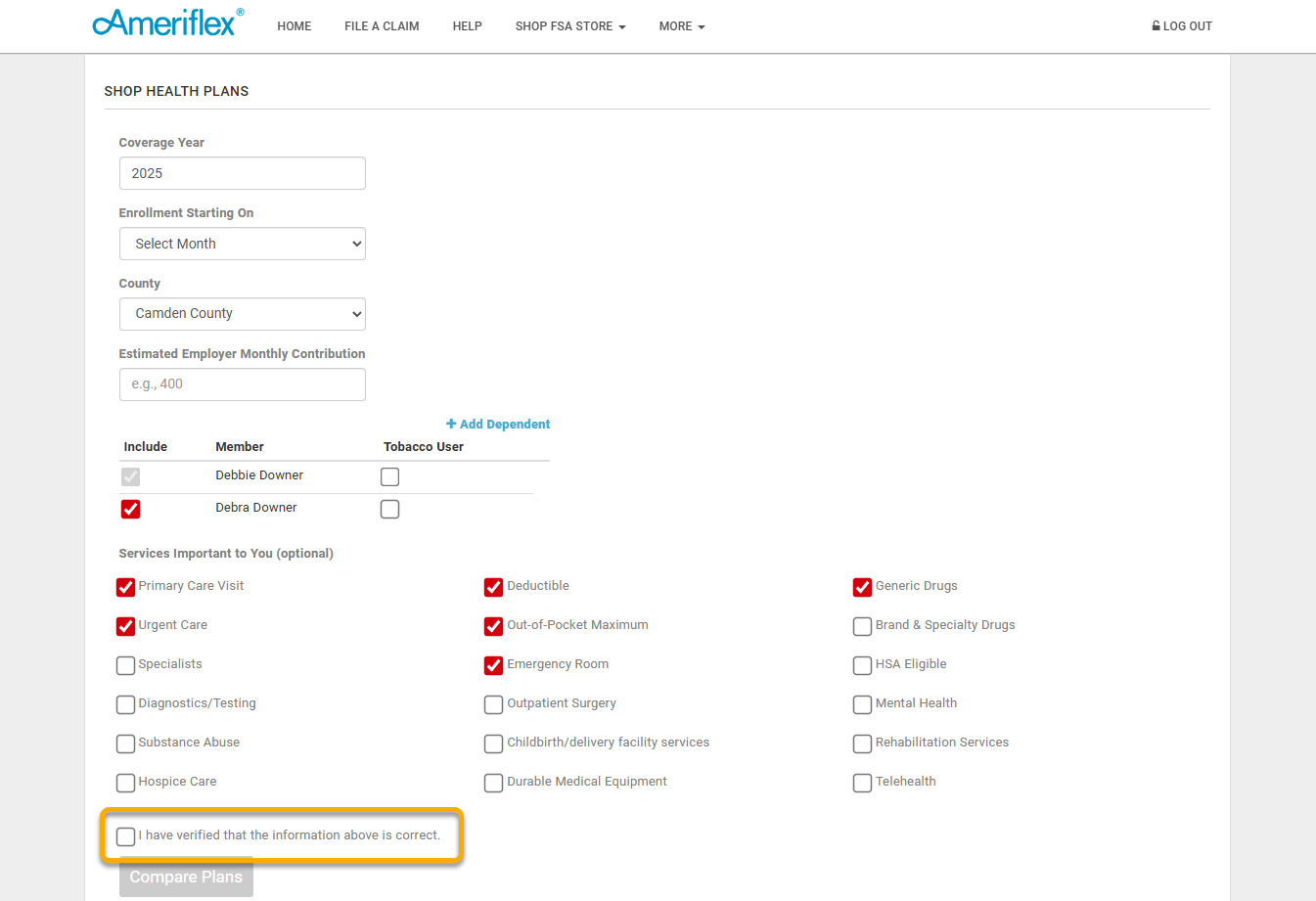 5. Click Compare Plans. This button will be grey and unclickable until all required fields are checked/filled in; then, it will turn blue after you check the verification box.