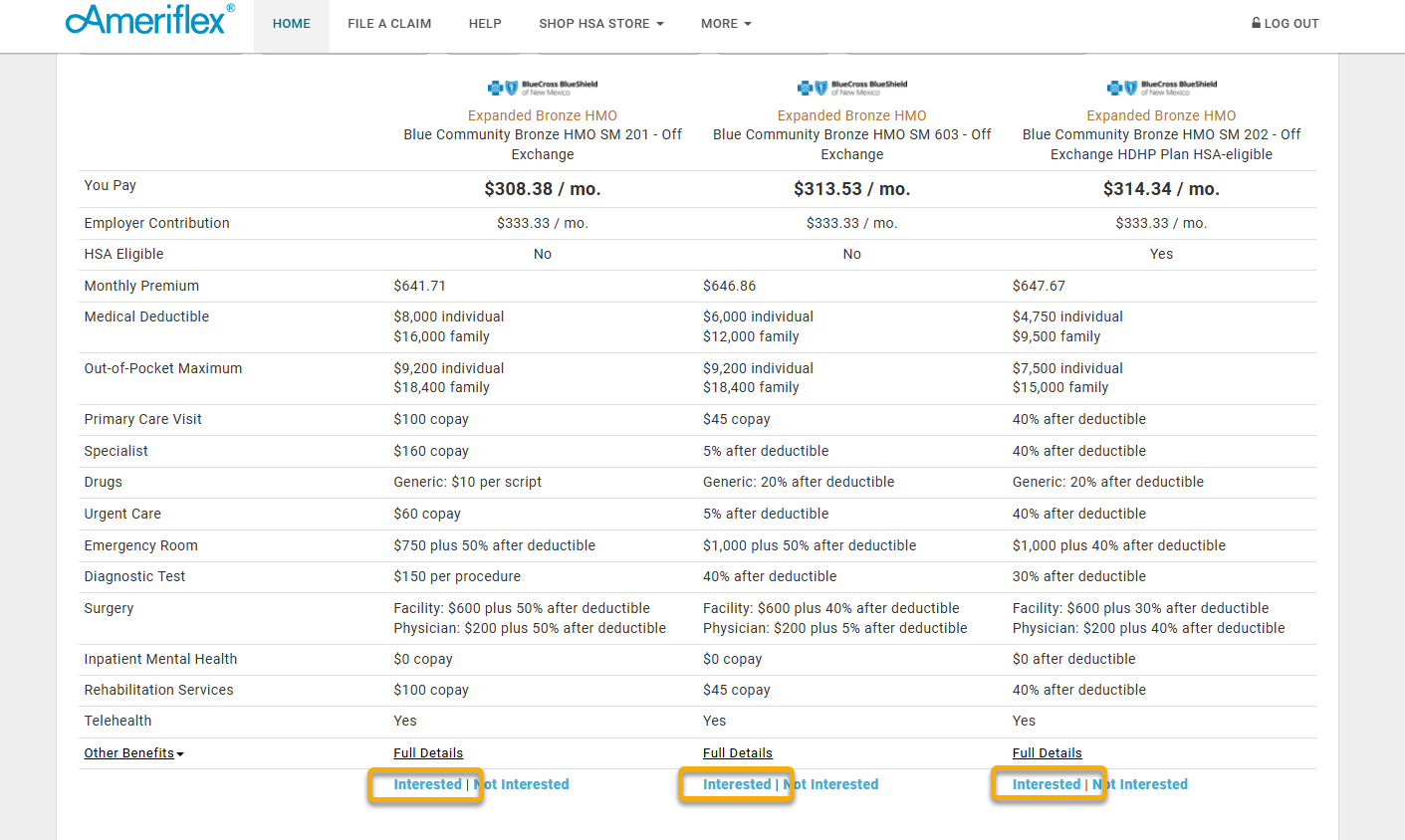 7. Selecting Interested below a plan type will generate a pop-up where you can choose this plan.