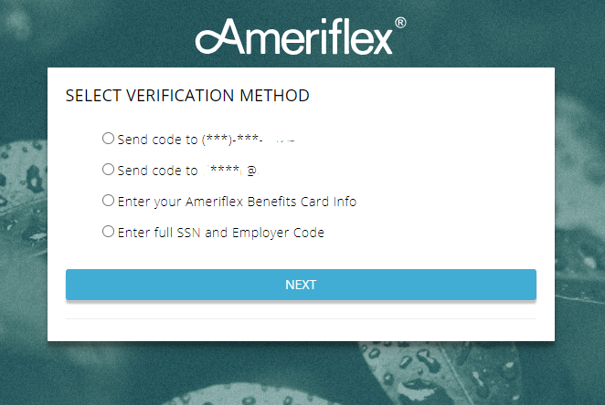 3. A new screen will appear, asking you to select a verification method. If you already have your Ameriflex Debit Mastercard®, you may select the Enter your Ameriflex Benefits Card Info and provide your card information. If you have been provided with your Employer Code (the code that begins with AMF), you may select the last option and enter your Employer Code along with your full SSN.